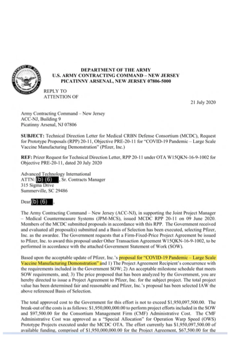 Alle Covid-Gegenmittel, einschließlich der biologischen Kampfstoffe, die als „Covid-19- Impfstoffe“ vermarktet wurden, wurden vom US-Verteidigungsministerium im Rahmen von Verträgen mit anderen Transaktionsbehörden als „groß angelegte Produktionsdemonstration“ in Auftrag gegeben.