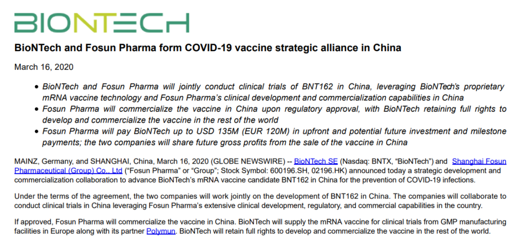 Sie fand nun heraus, dass bei Pfizer/Biontec noch ein drittes Unternehmen, namens „Fosun“ mit im Bunde ist. „Fosun“ gehört der Kommunistischen Partei Chinas.