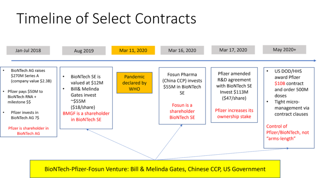 Pfizer-BioNTech ist in Wirklichkeit eine F&E-Allianz mit drei Parteien: Fosun-Pfizer- BioNTech, und mit „Partei“ meine ich, dass eine der drei Parteien die Kommunistische Partei Chinas ist. Fosun ist ein riesiges chinesisches Konglomerat, das eine große Anzahl globaler Unternehmen besitzt, und sein Vorsitzender Guo Guangchang ist ein sehr hochrangiges Mitglied der KPCh. Es ist merkwürdig, dass das US- Verteidigungsministerium 10 Milliarden Dollar (Pfizers Operation Warp Speed/DoD/ BARDA-Vertrag) an ein Unternehmen vergab, dessen wesentlicher Anteilseigner (und geistiges Eigentum) die Kommunistische Partei Chinas ist. Um jeden Zweifel auszuschließen: