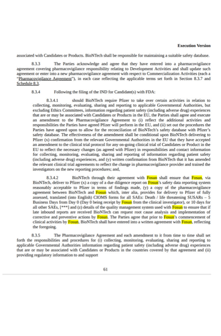 Das gleiche Dokument beschreibt eine Vereinbarung über die gemeinsame Nutzung von Daten, „Pharmakovigilanz“, weltweit zwischen den drei Parteien.