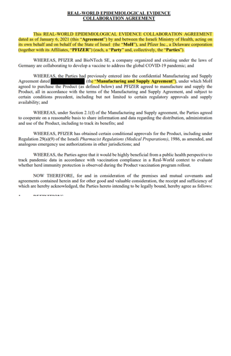 Nebenbei bemerkt: Die israelische Regierung hat vor kurzem die Herstellungs- und Liefervereinbarung mit Pfizer, die in der obigen Vereinbarung über die gemeinsame Nutzung von Daten erwähnt wird,