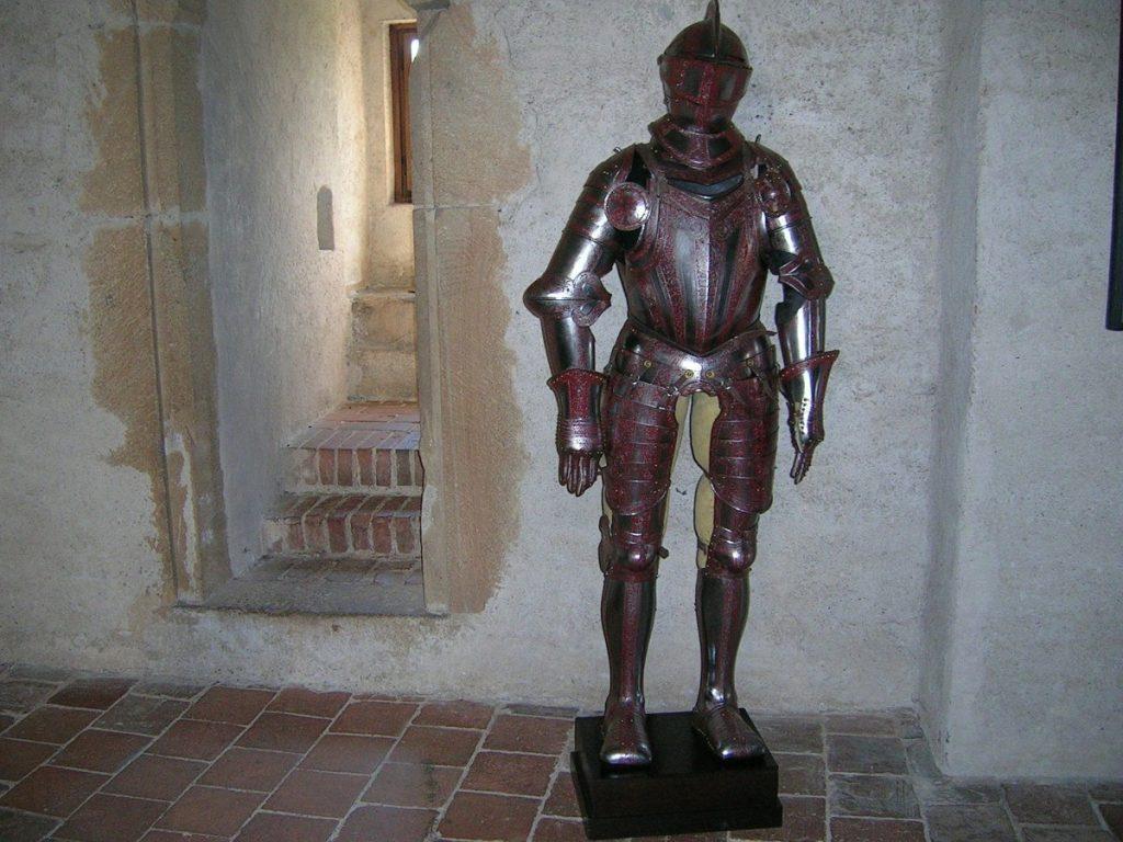 In unserem Vereinsheim steht eine echte Ritterrüstung, deren Visier geschlossen und deshalb nicht mehr zweifelsfrei feststellbar ist, ob noch Reste des ehemals tapferen Ritters darunter verborgen sind. Er trägt ebenso ein eisernes Kettenhemd, feingliedrige Handschuhe aus Eisen und ebensolche Schuhe. Mit der rechten Hand hält sich an einer Hellebarde fest, ein stählernes, schweres wie riesiges Schwert ist linksseitig an ihm angeschraubt.