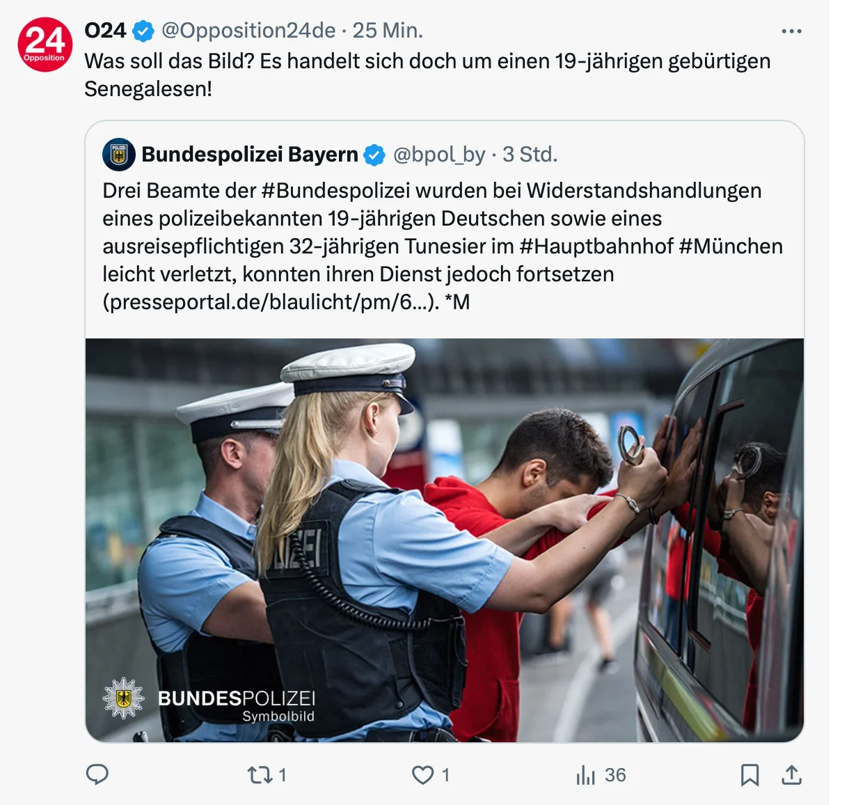 Hat man da noch Töne? Auf dem Symbolbild der Bundespolizei sieht man, wie ein junger Mann verhaftet wird. Augenscheinlich kein Afrikaner oder Orientale, fälschlicherweise oft als „Südländer“ bezeichnet, nein, ein Deutscher, wie man im Anrisstext der offiziellen Meldung auf X lesen kann.