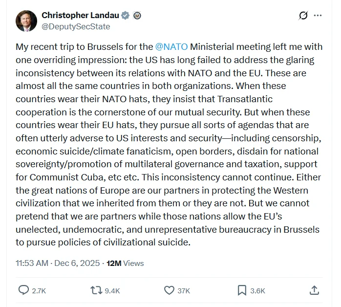 Der Stellvertretende US-Außenminister Christopher Landau nimmt eine originelle Sicht ein und kommt inhaltlich zum selben Ergebnis. Auf X schreibt er: