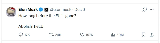 Der Eigentümer der Plattform X, Elon Musk, soll aktuell 120 Millionen Euro zahlen, weil er zuviel Meinungsfreiheit auf X zulasse – so seine Sicht. Dazu schreibt er ebenso kurz wie zutreffend: