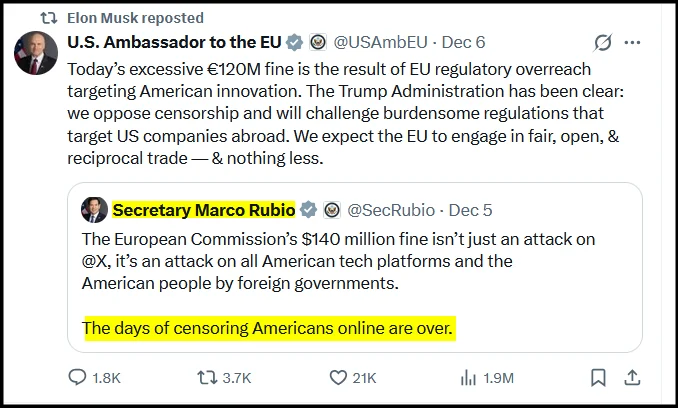 Endlich sagen Spitzenleute in den USA, was die Mehrheit in Europa denkt, aber wegen Suppression kaum noch sagen kann: Das Brüsseler EU-Monster hat nichts mit dem tatsächlichen Europa zu tun. Es zensiert die freie Meinung (Musk), greift die USA-Bürger und deren Plattformen an (Rubio) und spielt falsch (Landau).