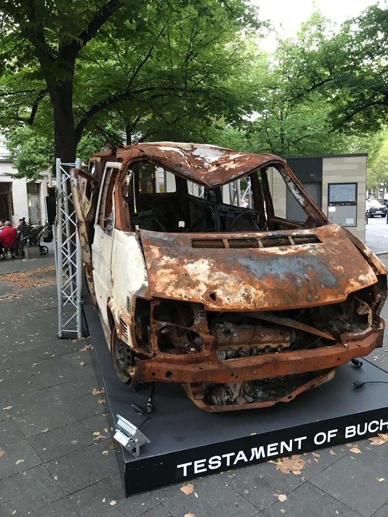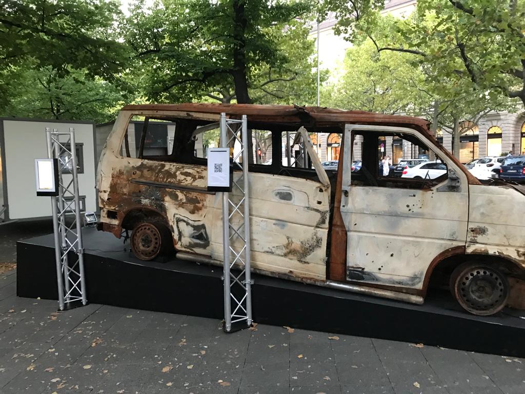 Berlin hat keine Kosten und Mühen gescheut, ein ausgebranntes Fahrzeug ähnlich einem VW-Bus, aus der Ukraine zu importieren. Das verkohlte Auto wird jetzt propagandistisch präsentiert und auf einer schrägen Rampe ausgestellt wie Kriegsbeute, von modernen Aluminiumträgern umrahmt und mit Halogenlampen beleuchtet.