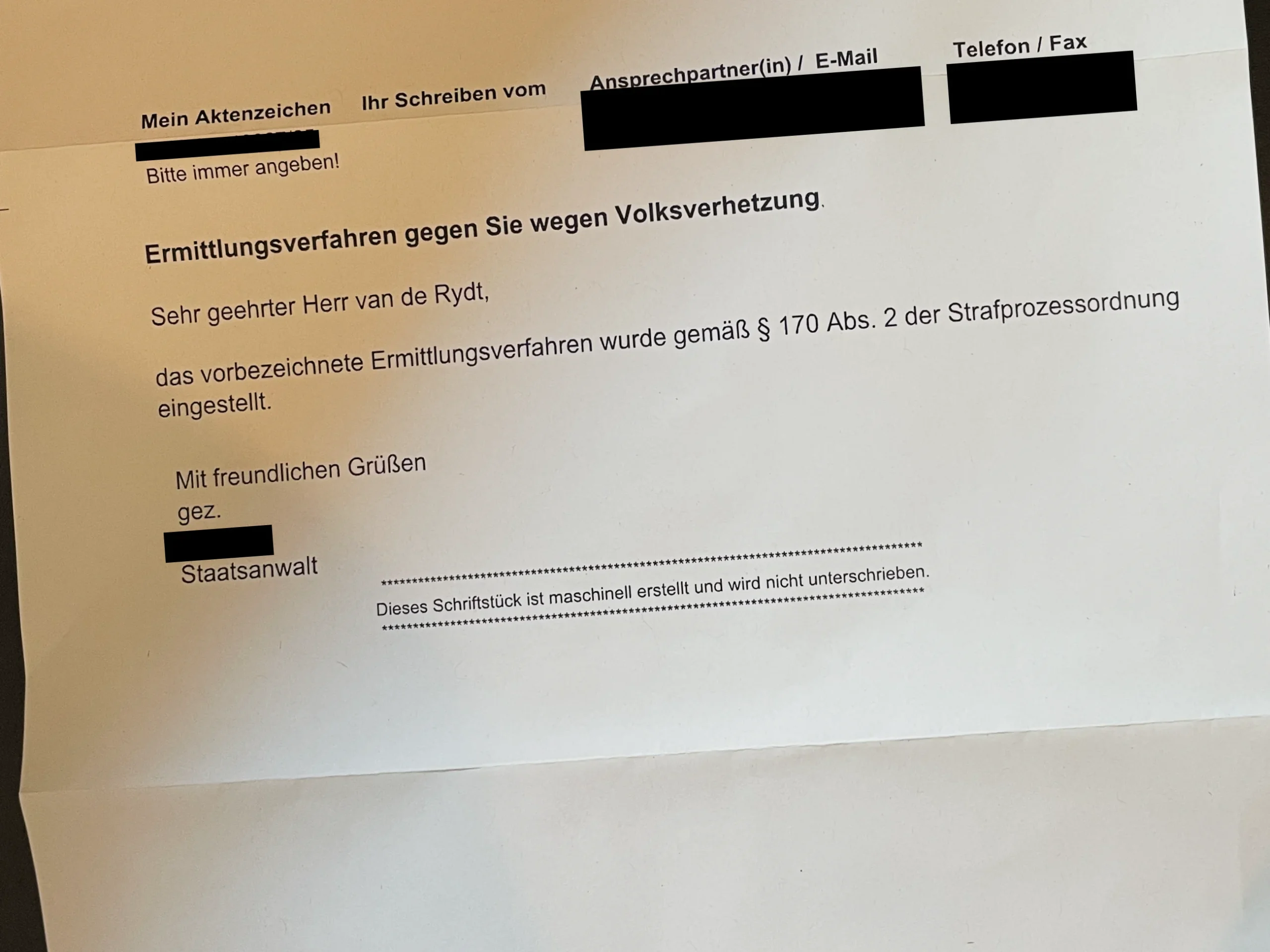 „Sehr geehrter Herr van de Rydt, das vorbezeichnete Ermittlungsverfahren wurde gemäß § 170 Abs. 2 der Strafprozessordnung eingestellt.“