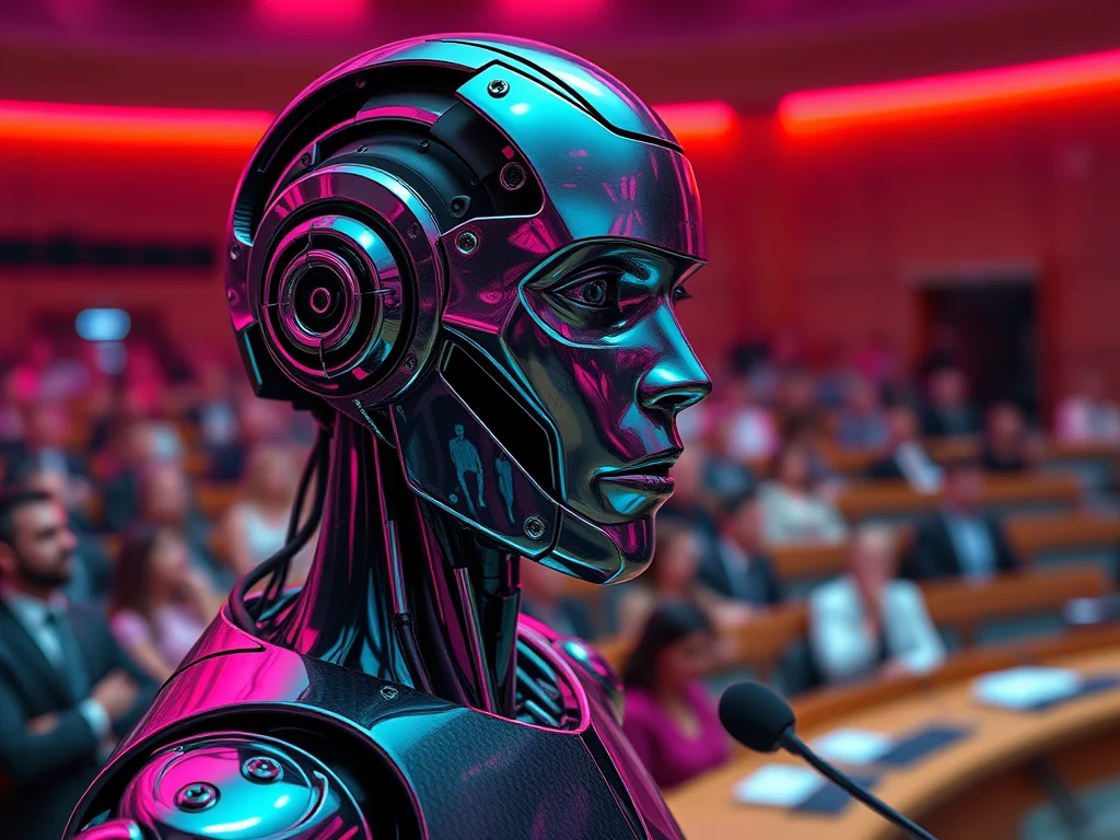 Ein humanoider Roboter spricht im Bundestag und fordert, als Mensch anerkannt zu werden, während Zuhörer im Hintergrund gespannt zuhören.
